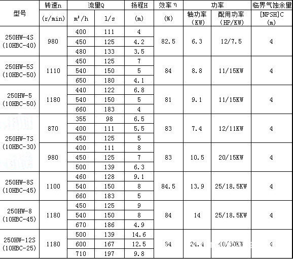 250HW混流泵性能参数表