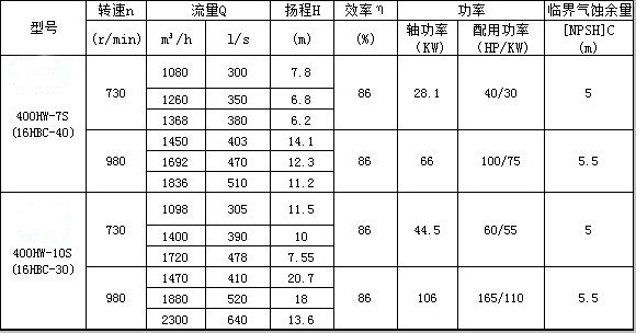 HW混流泵主要技术参数换算